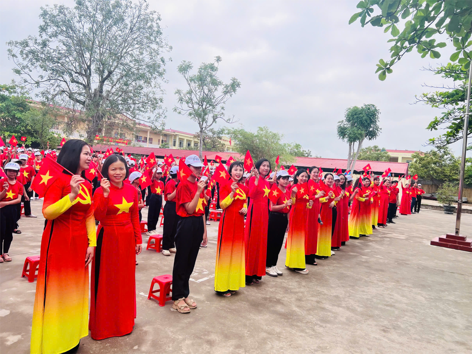 Không khí tại sân trường rộn ràng, sôi nổi với sắc đỏ rực rỡ từ trang phục áo cờ đỏ sao vàng của toàn thể thầy cô và học sinh. Buổi hoạt động diễn ra trong không khí trang nghiêm, hào hứng và đầy ý nghĩa, với sự dẫn dắt sinh động của thầy cô cùng hai MC tài năng: Hoàng Đăng Khôi (lớp 9A) và Hoàng Thảo Chi (lớp 8A).